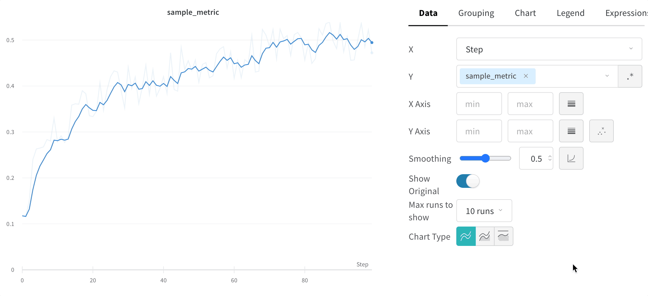 デフォルトでは、オリジナルの非平滑化データを背景として薄い線で表示します。この表示をオフにするには、Show Original トグルをクリックしてください。