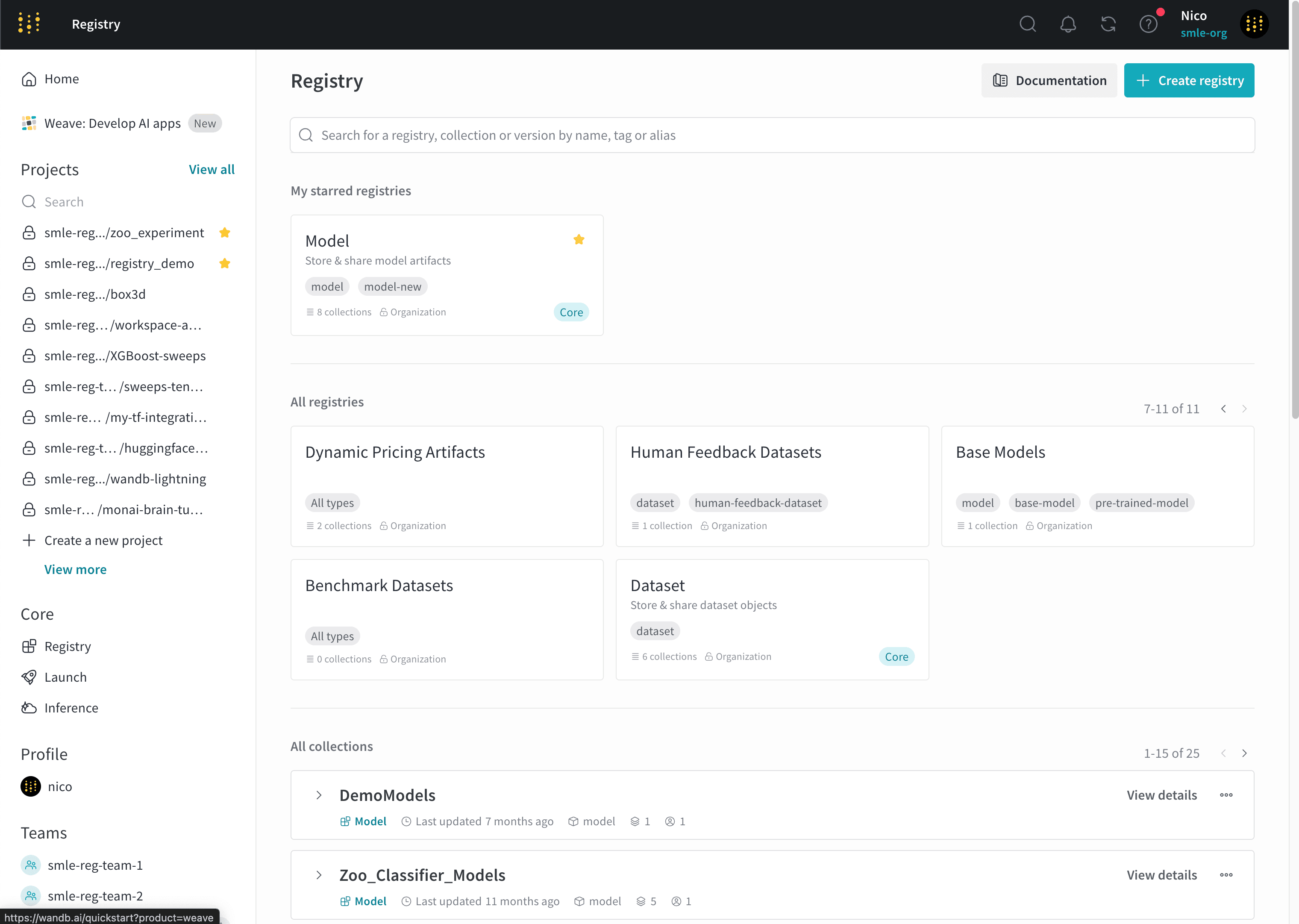 • W&B Registryを使用してアーティファクトを管理し、バージョン管理、リネージトラッキング、および異なるライフサイクルステージへのモデルプロモートを行います。